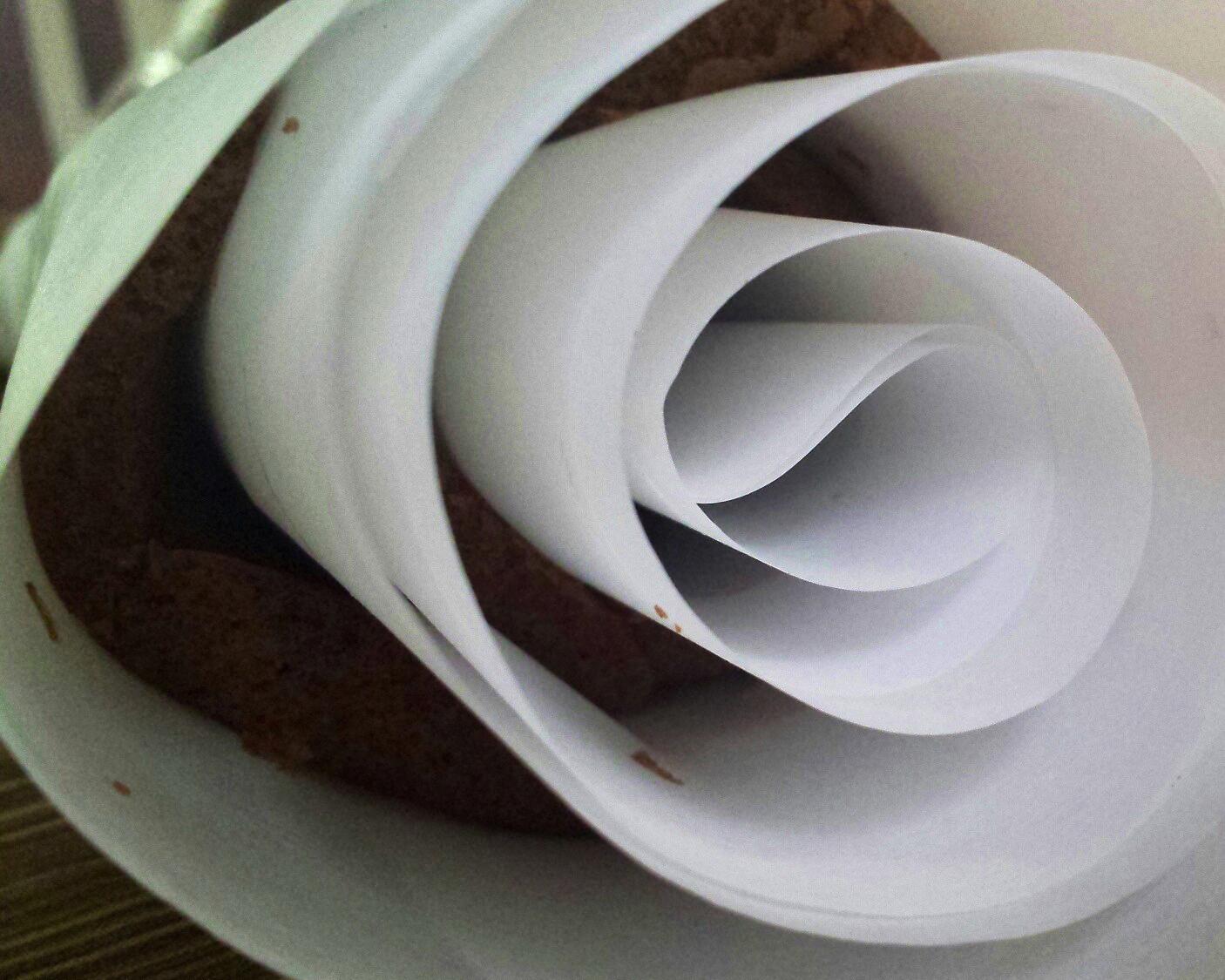 Para rechear o rocambole, desenrole o bolo e desgrude dele o papel manteiga. Espalhe o creme de chocolate do passo anterior e volte a enrolar cuidadosamente, para não quebrar.