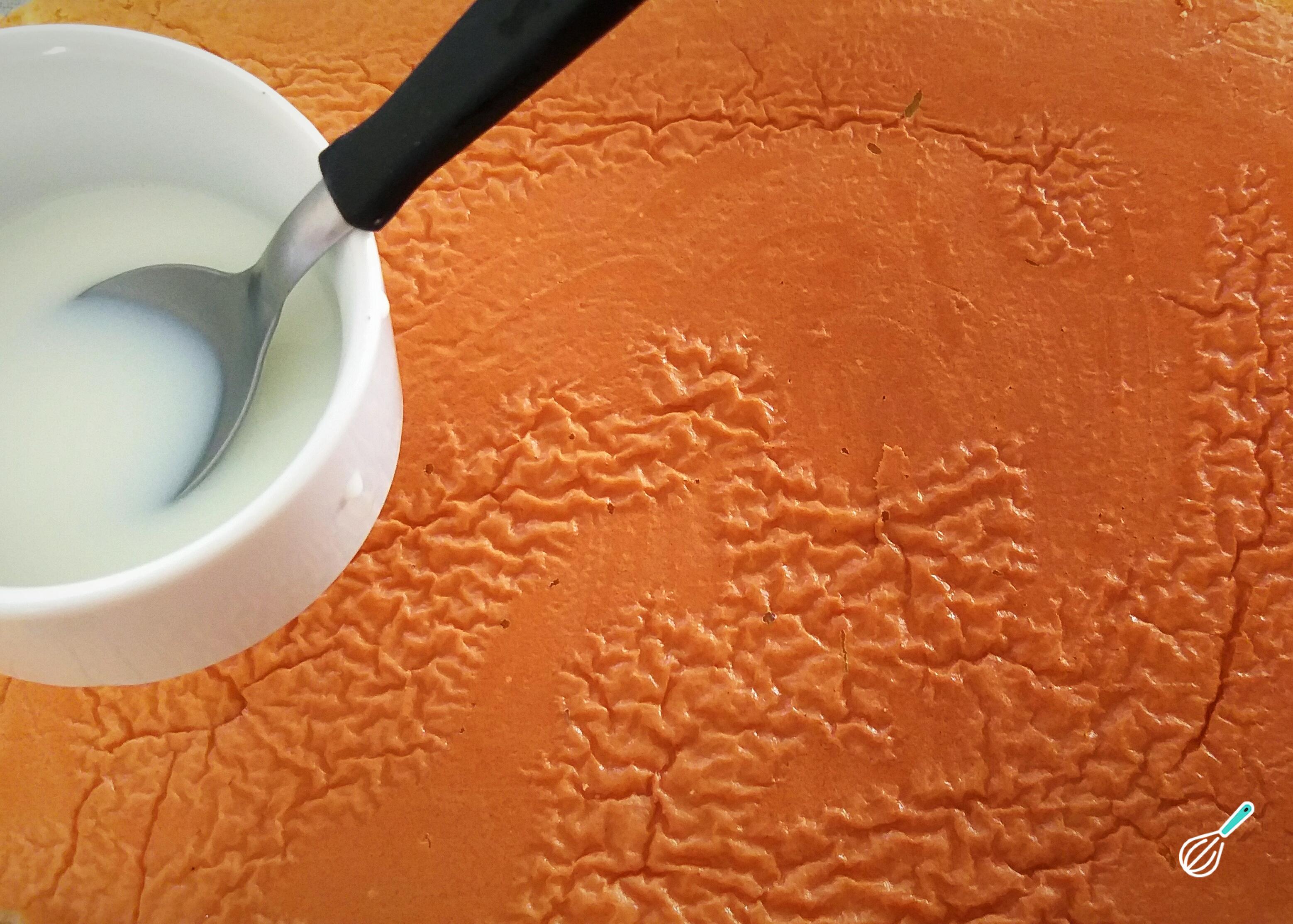 Coloque o bolo rocambole já assado sobre o pano e regue com o leite, para umedecer.