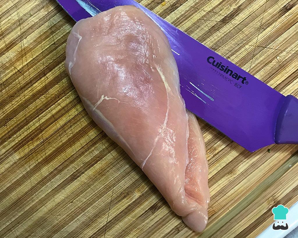Comece seu super rocambole de frango recheado com ricota e brócolis abrindo o peito de frango ao meio, sem cortar até o final, deixando ele aberto como se fosse uma borboleta.