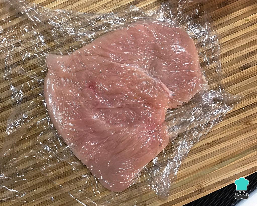 Coloque sua borboleta de peito de frango entre duas folhas de papel filme e bata com a ajuda de algum objeto plano, para deixar o peito de frango bem fininho. Tempere dos dois lados com sal e pimenta.