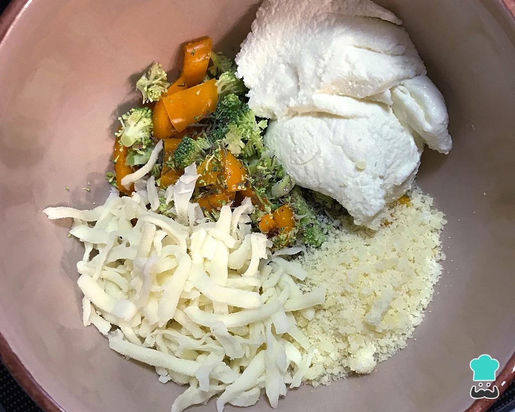 Misture agora os ingredientes do recheio (a ricota, o parmesão, a mossarela ralada, o brócolis, o pimentão, o sal e a pimenta).
