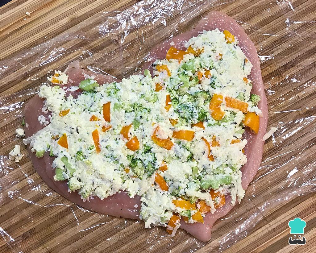 Retire o filme de cima do peito de frango (deixe o de baixo) e coloque o recheio, espalhando por todo o frango.