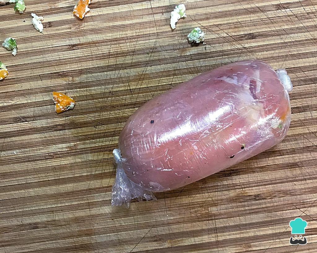 Com a ajuda do papel filme enrole o franguinho no formato de um rocambole, apertando bem as laterais. Leve para geladeira por pelo menos 15 minutos, para manter o formato.