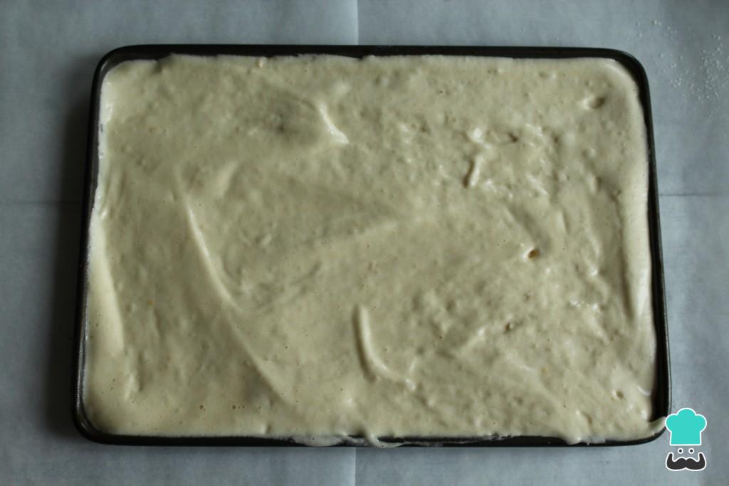 Use papel manteiga para forrar fundo de uma forma retangular, e coloque aí a mistura anterior, alisando bem. Leve a assar no forno preaquecido a 180ºC por 25 minutos, ou até passar no teste do palito.