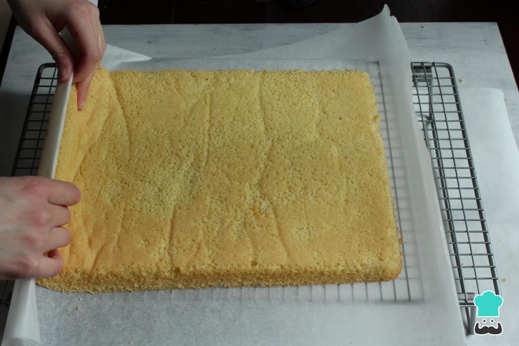 Quando a massa estiver assada, retire do forno e desenforme ainda quente sobre uma folha de papel manteiga. Enrole como um rocambole e deixe ficar assim por 1 ou 2 horas, para que a massa não quebre.