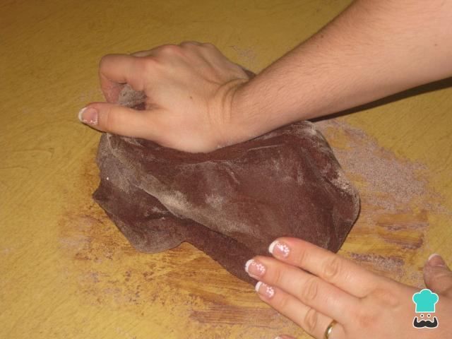 Ao inicio parece que não vai dar certo, pois a massa gruda muito e fica pesada. No entanto continue amassando, de preferência em umabancada polvilhada com cacau ou chocolate em pó, até ficar homogênea e brilhante.