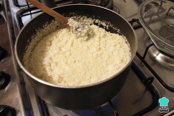 Prepare o recheio desta sobremesa de leite Ninho simplesmente levando ao fogo baixo o leite condensado e o coco. Fique mexendo até engrossar em ponto de beijinho mole.