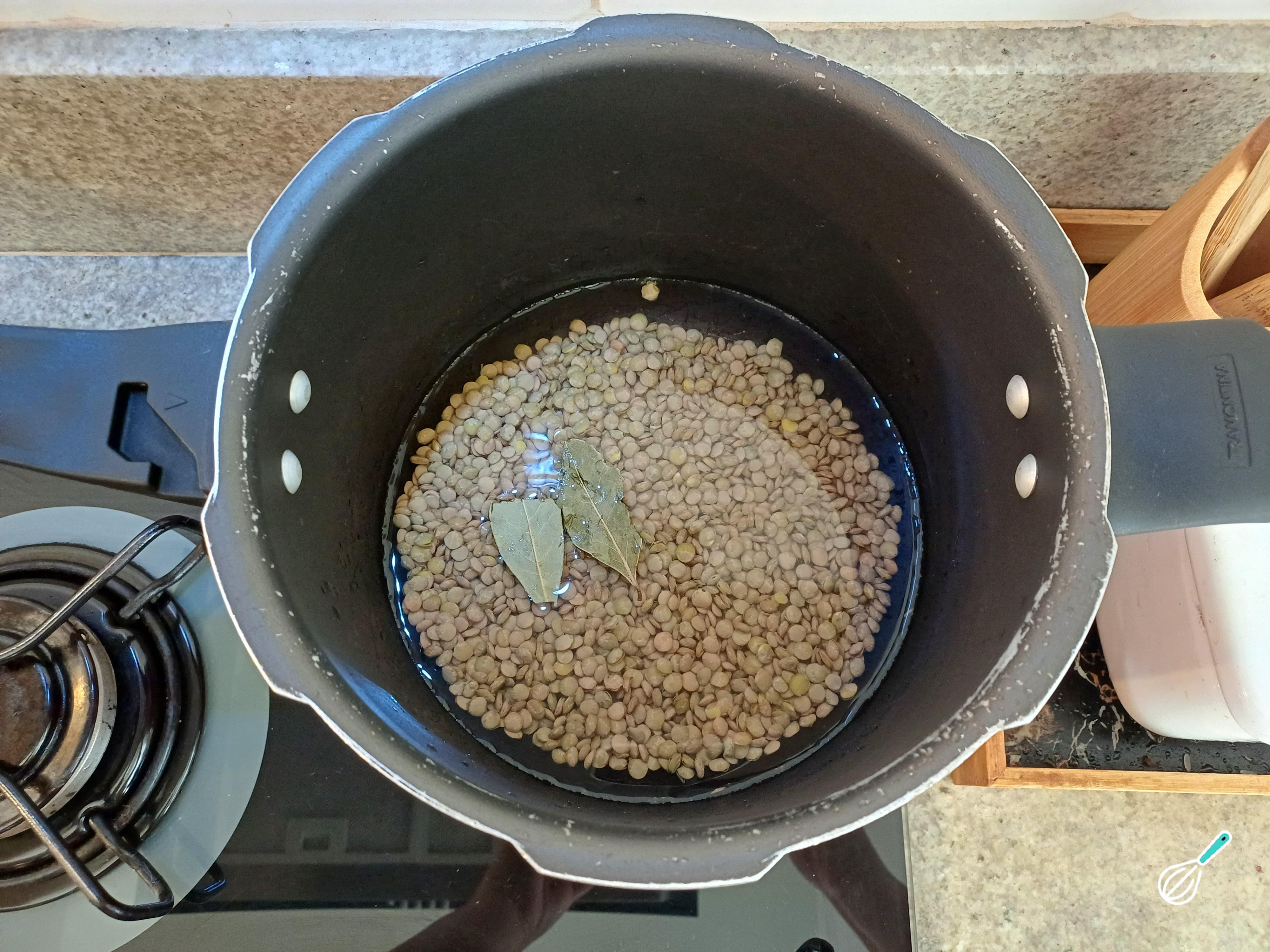 Lave bem a lentilha e coloque em uma panela de pressão, juntamente com 1 xícara de 1/2 de água e as folhas de louro e deixe cozinhar por 5 minutos após pegar pressão.