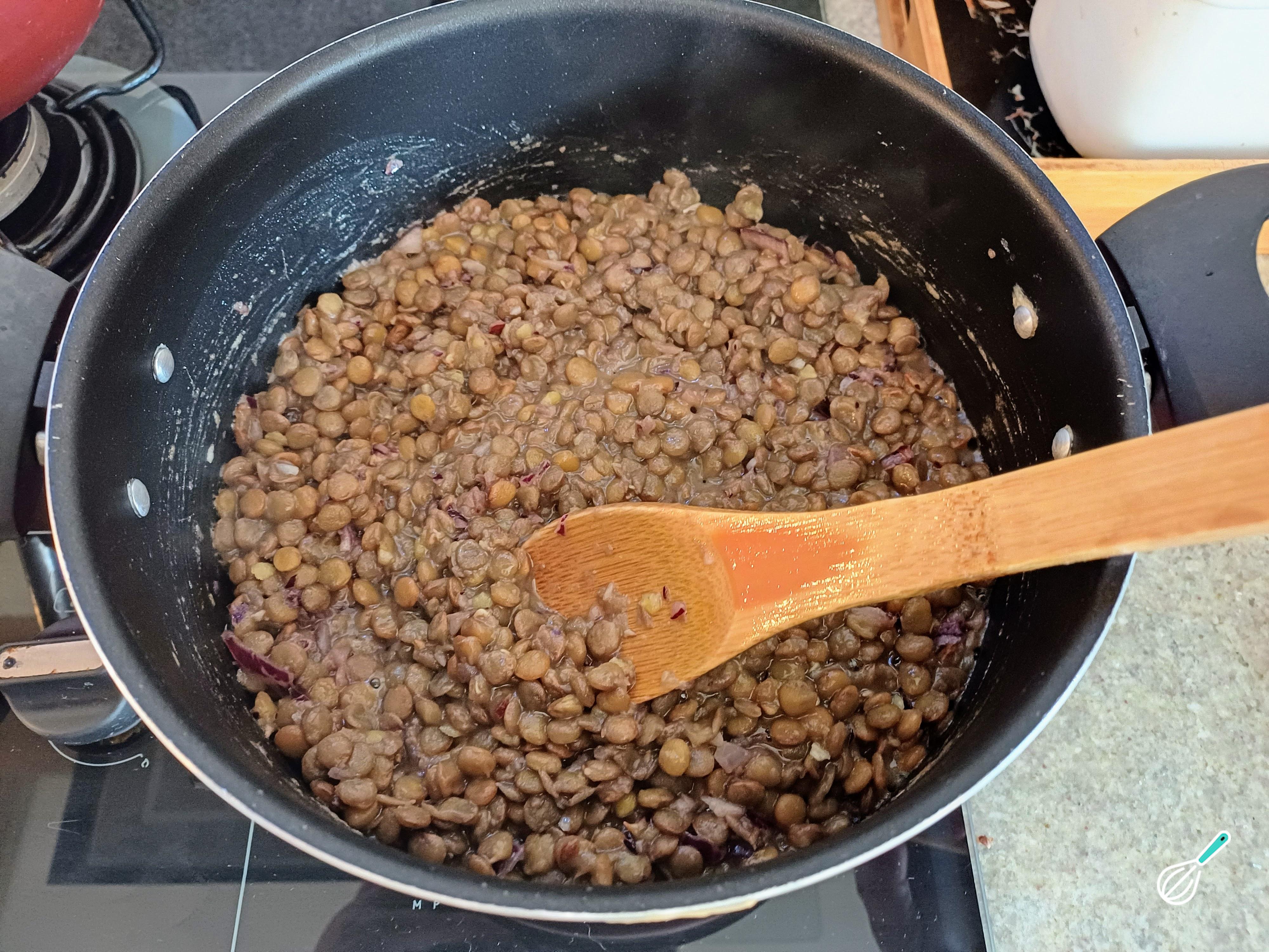 Em outra panela, coloque o azeite, o alho, a cebola e refogue bem. Misture a lentilha cozida e deixe cozinhar por mais 3 minutos, mexendo para não queimar.