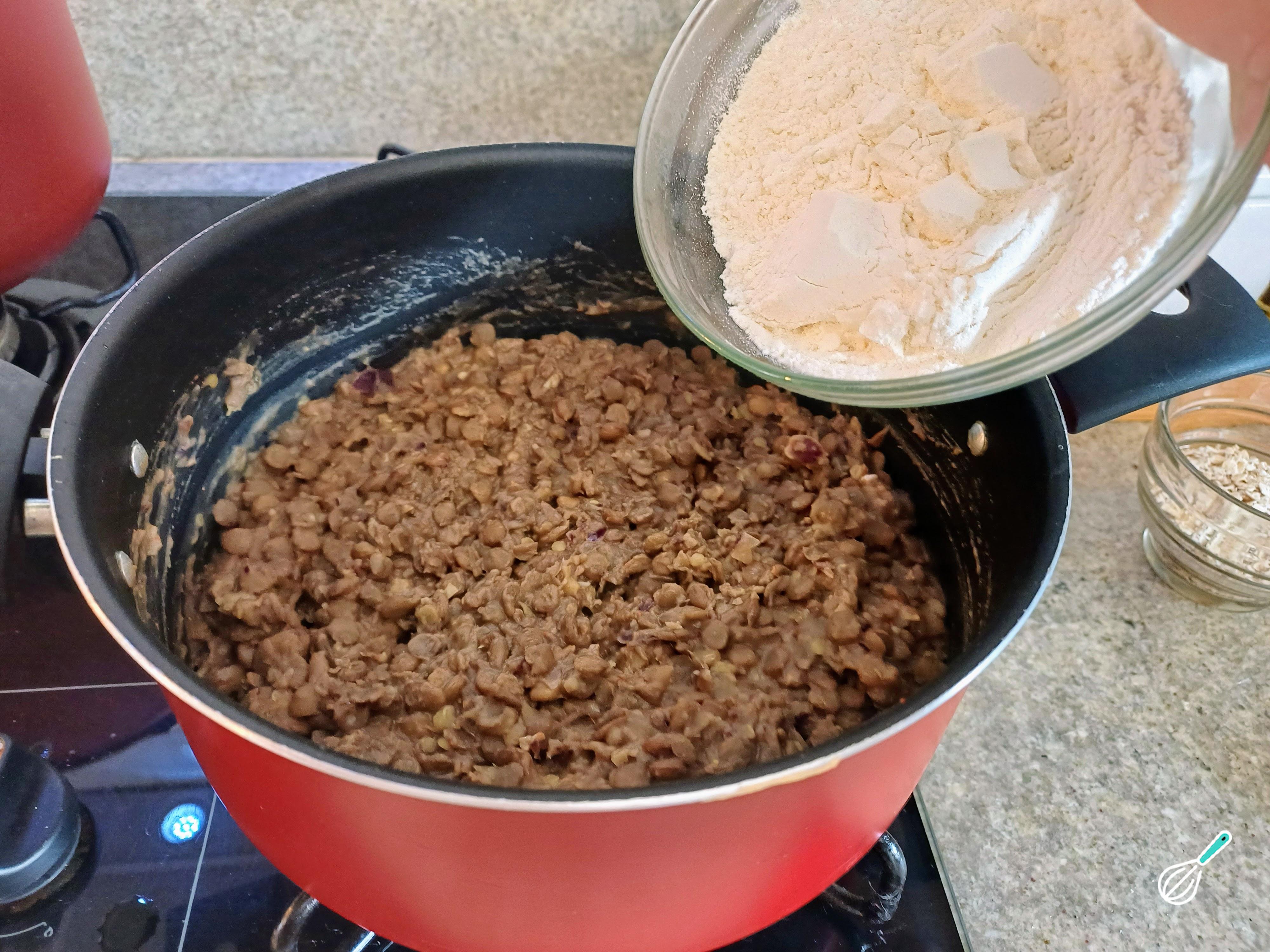 Desligue o fogo e acrescente a farinha de trigo e a aveia, misture bem, e deixe esfriar completamente antes de montar o rocambole.