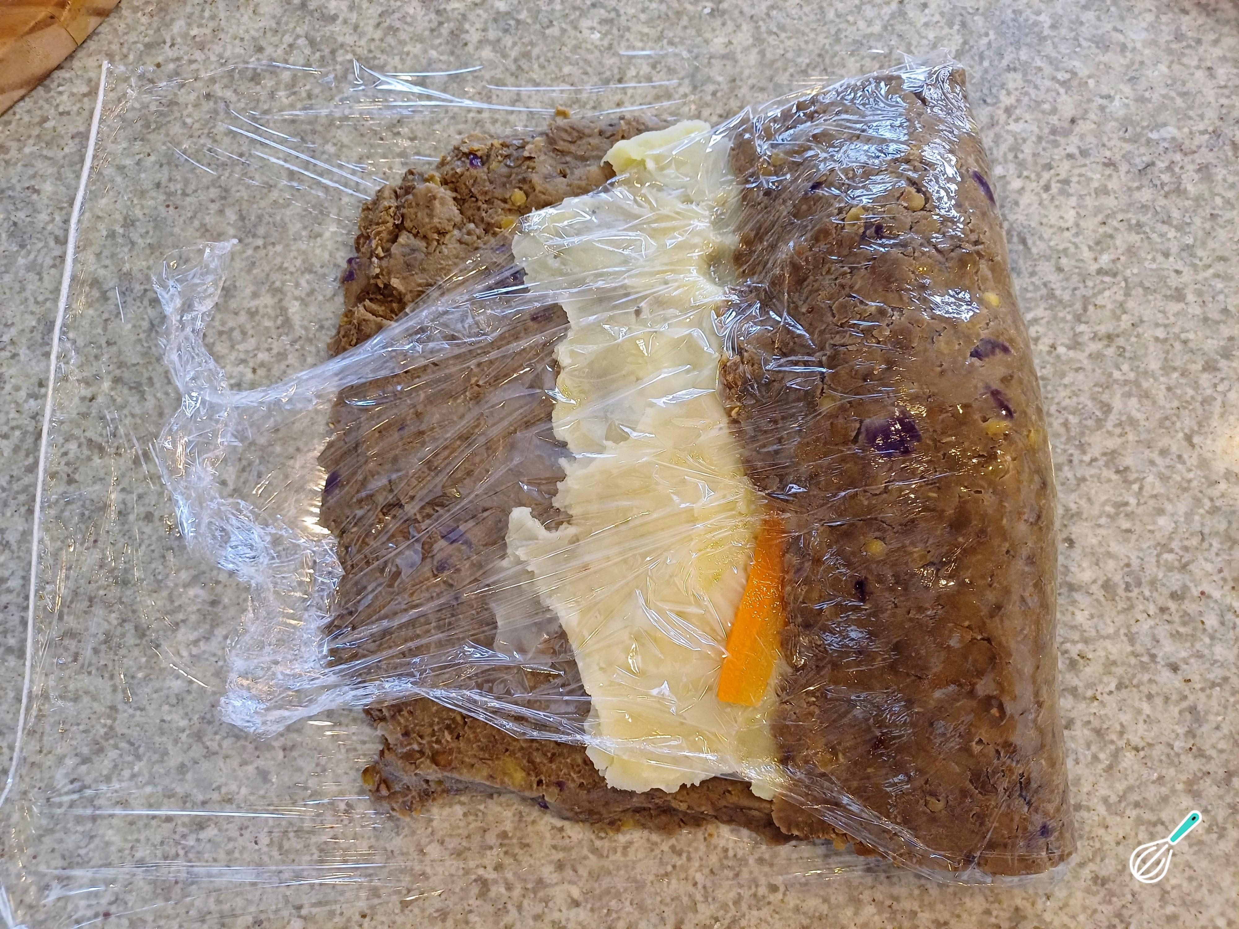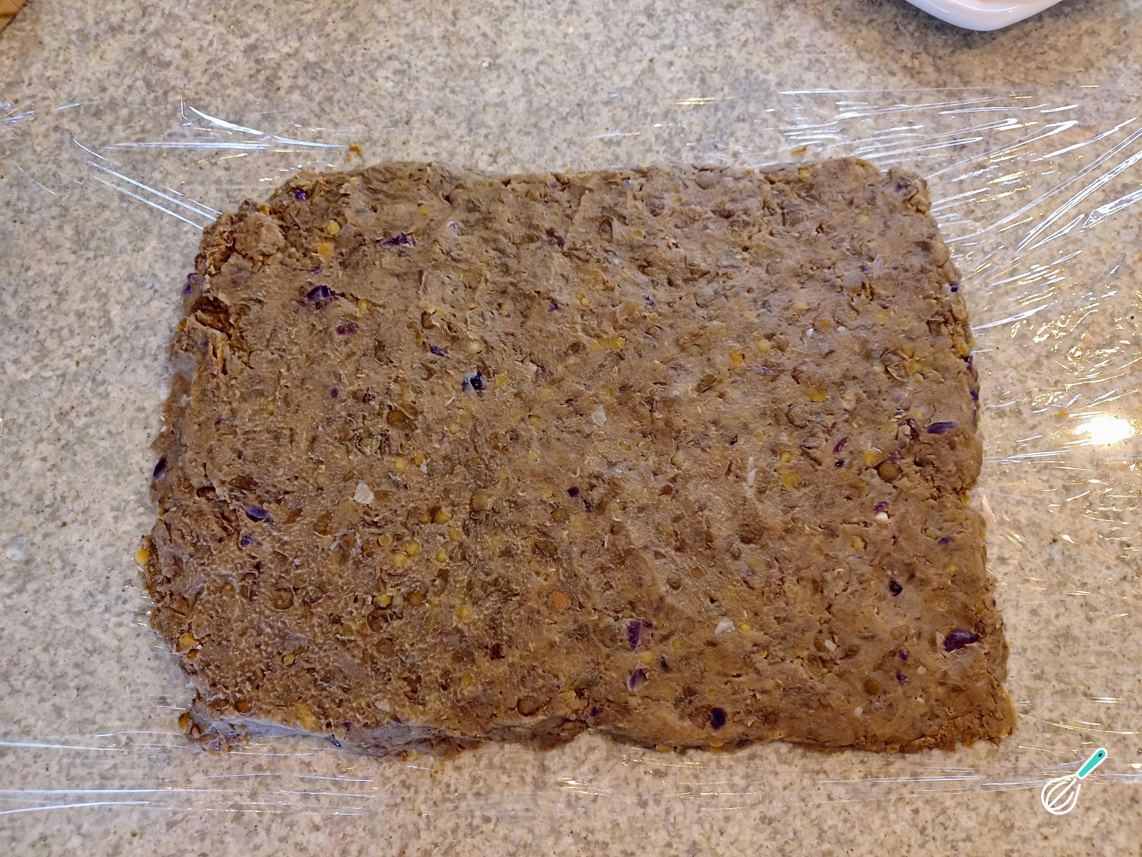 Distribua a massa de lentilha sobre um pedaço de plástico filme, até formar um retângulo, aperte bem com as mãos, acertando as laterais.