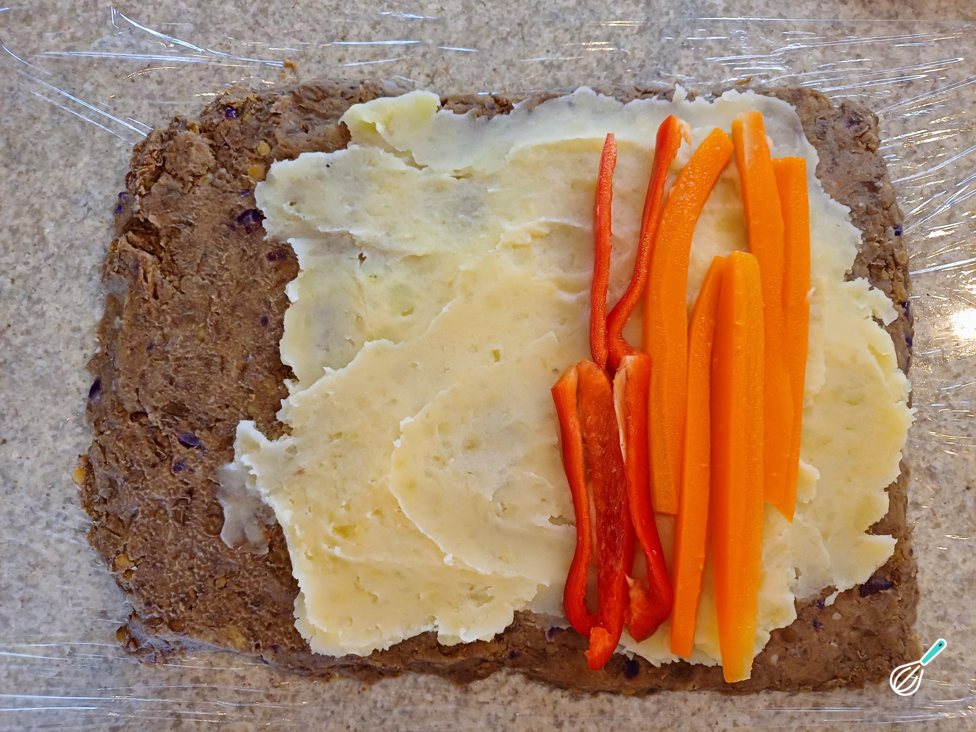 Espalhe sobre a superfície, o purê de batatas, a cenoura e o pimentão. Mas reserve uma margem nas bordas sem recheio para facilitar o fechamento do rocambole.
