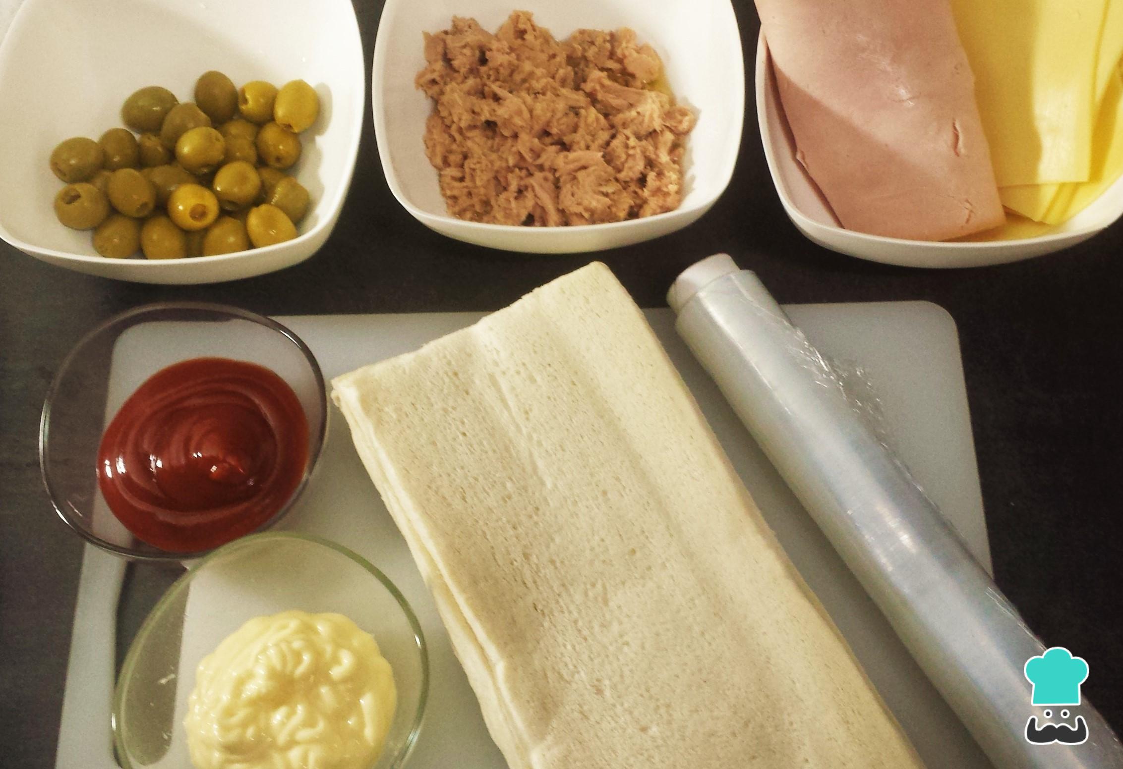 Para preparar estes rocambole salgado, a primeiro coisa a fazer é reunir todos os ingredientes. Tenha em mente que o pão deve ser especial para enrolar ou cortado na horizontal, no sentido longitudinal. Este pão pode ser facilmente encontrado no supermercado ou numa padaria da sua confiança.
