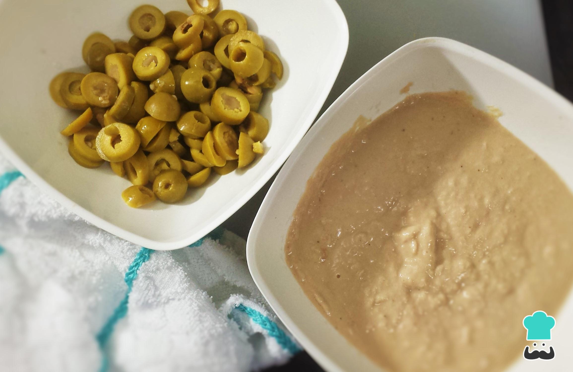 Para o rocambole salgado de atum e azeitona bata no liquidificador o atum com a maionese até obter uma pasta, tempere com sal a pimenta. Corte as azeitonas em rodelas.
