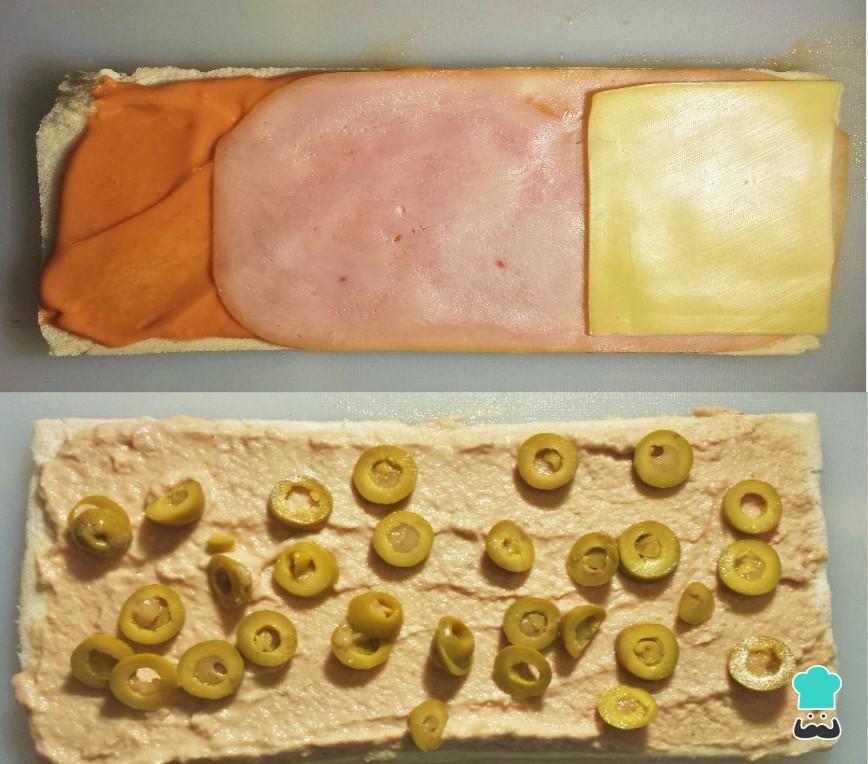 Numa das fatias longas do pão espalhe a pasta de atum e polvilhe as azeitonas. Noutra fatia espalhe a mistura de maionese e ketchup e disponha as fatias de presunto e queijo.