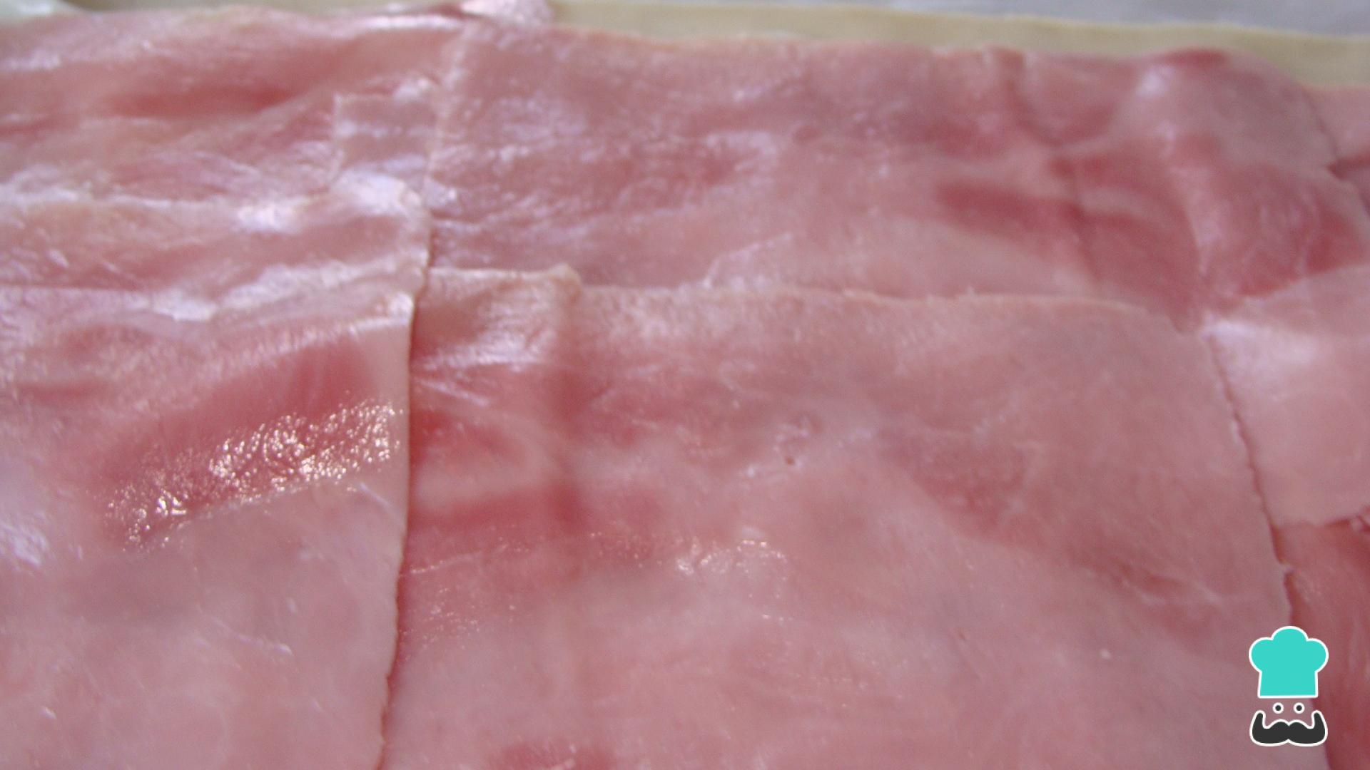 Depois de assar desenforme a massa em um pano de prato úmido. Espalhe maionese ou requeijão a gosto e disponha as fatias de presunto e de queijo. Enrole ainda quente com a ajuda do pano.