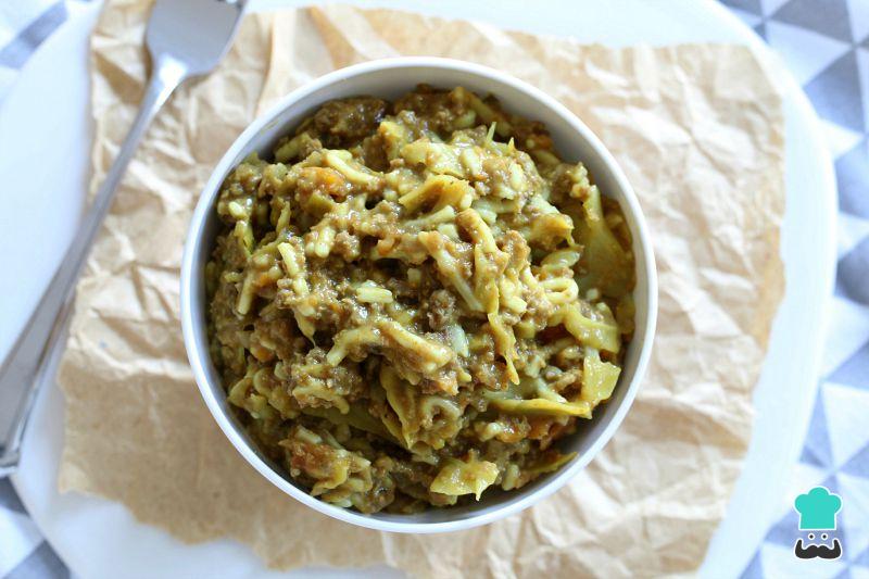Separadamente, refogue o repolho. Junte a carne, a cebolinha e o gengibre e tempere com açúcar, sal e shoyu. Misture tudo e, caso seja necessário dar consistência, adicione a maisena previamente dissolvida em água. Desligue o fogo.