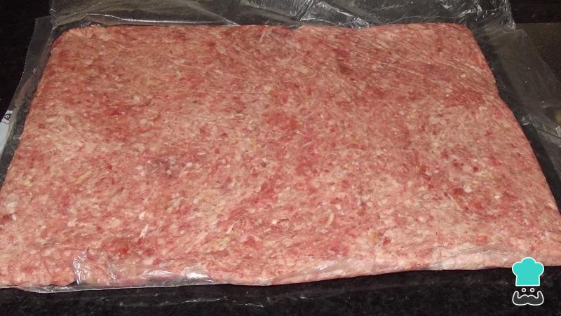 Estenda uma folha de papel alumínio, papel filme ou papel manteiga sobre uma superfície lisa e polvilhe farinha de rosca. Coloque sobre ela a carne picada e espalhe-a formando um retângulo de carne.