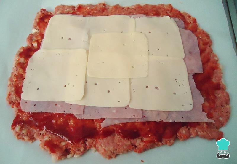 Este é o momento em que você recheia o rolo de carne com o que preferir. Nossa sugestão é que espalhe molho de tomate e, sobre ele, disponha fatias de presunto e queijo, fica muito gostoso!