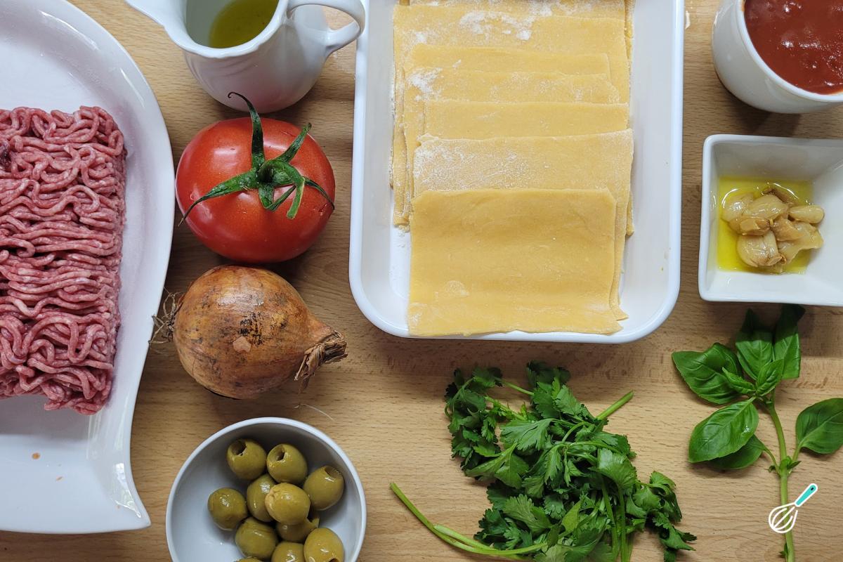 Separe os ingredientes para fazer seu rondelli de carne moída. A massa do rondelli pode ser massa fresca de lasanha, como a que usei aqui ou até mesmo massa de pastel, se preferir. Também é possível usar massa seca de lasanha, mas nesse caso dá bem mais trabalho porque é preciso pré-cozinhar as folhas de lasanha.
