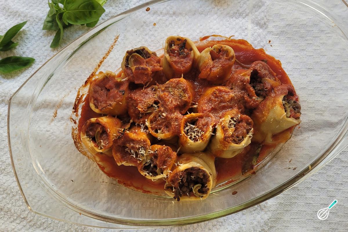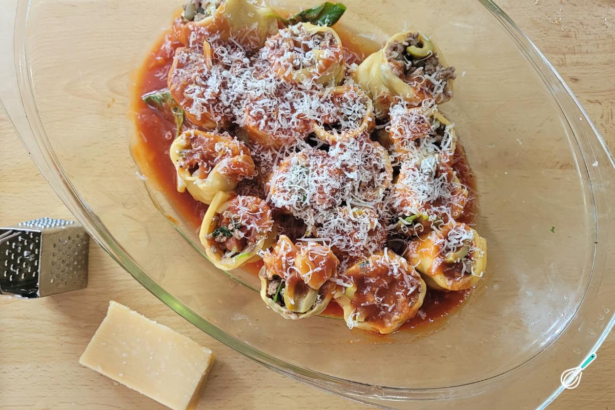 Existem diversas versões de rondelli. Aqui, ele ganhou um recheio à base de carne moída e um molho bem simples de tomate, manjericão e alho. O rondelli pode ser feito com massa de lasanha ou até mesmo massa de pastel, se preferir.