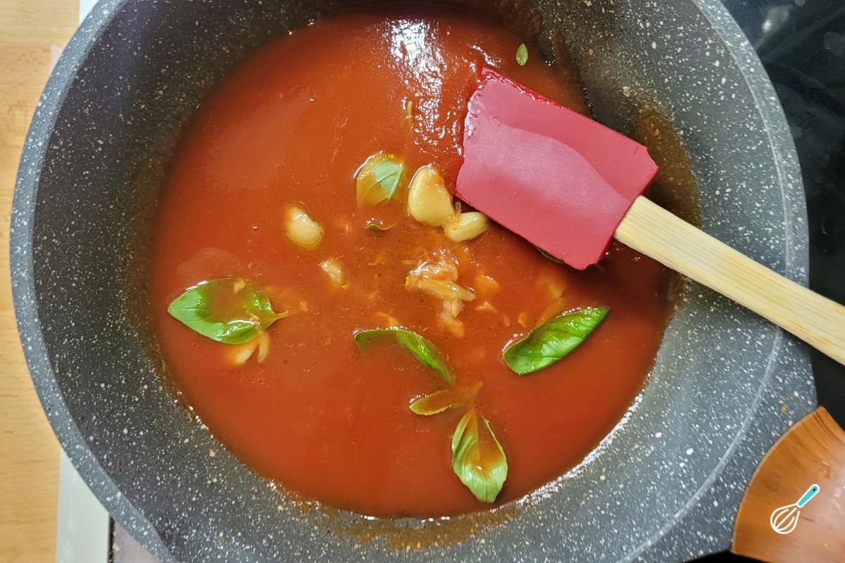 Usando o alho assado, basta juntar a passata de tomate, o alho assado e as folhas de manjericão em uma frigideira e ir amassando os dentes de alho até que se misturem ao molho. Se preferir usar o alho cru, basta refogar com um fiozinho de azeite antes de adicionar a passata de tomate e o manjericão.