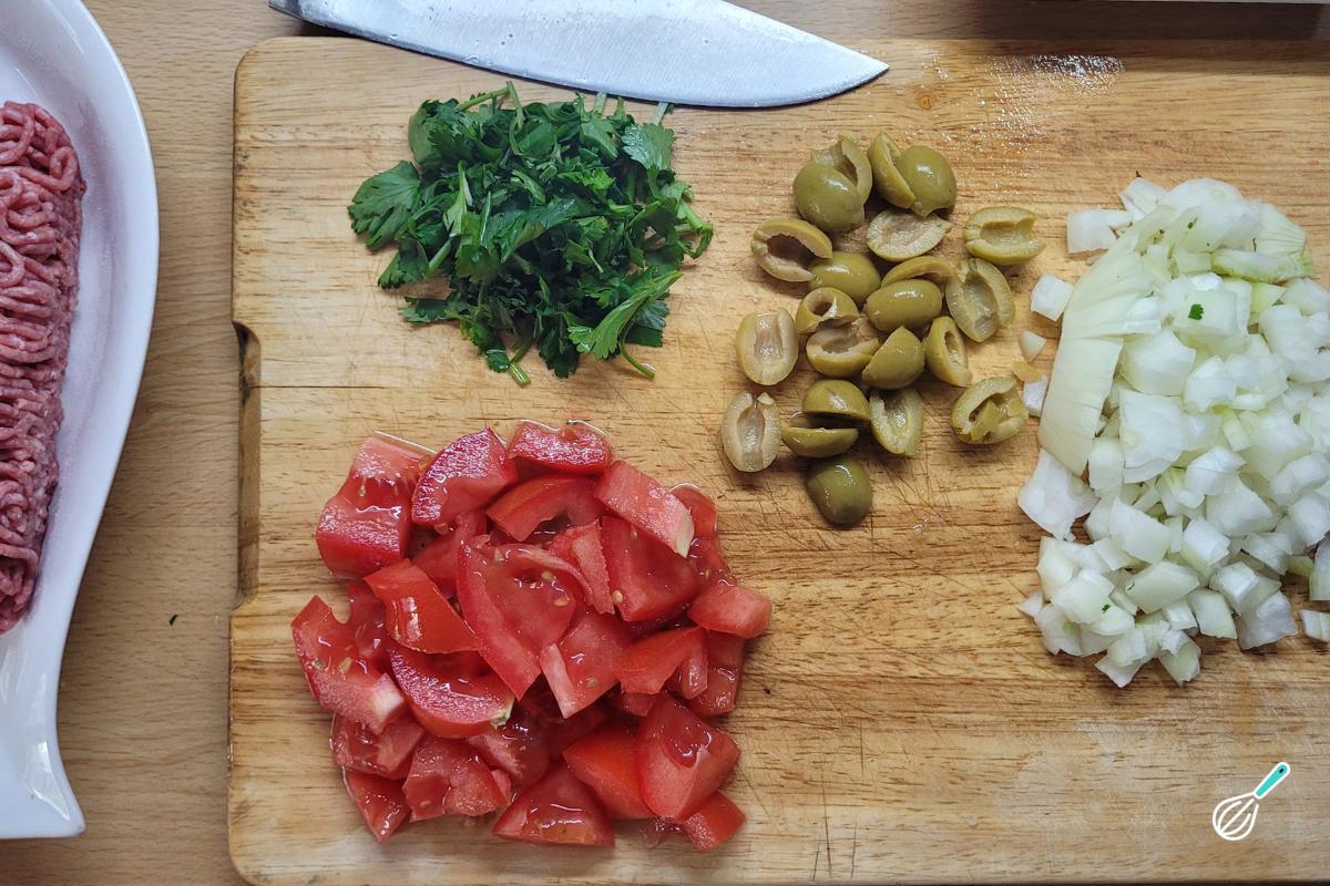 Para o recheio, comece cortando a cebola e o tomate em cubinhos. Corte também a azeitona em pedaços menores e pique fino o coentro.