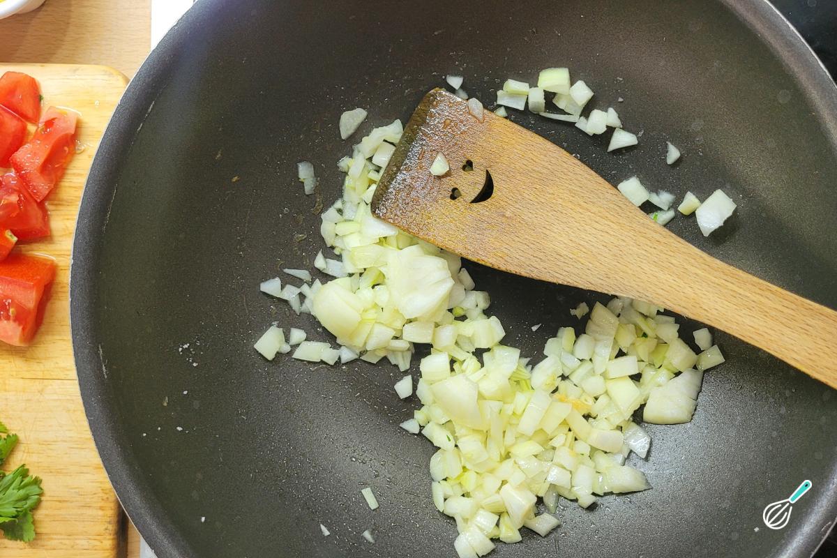 Em uma frigideira com um fio de azeite, leve a cebola para refogar. Adicione um pouco de sal para acelerar o processo.