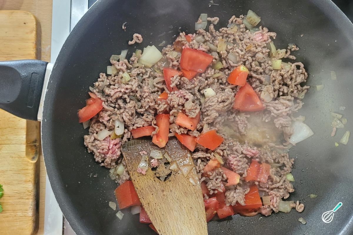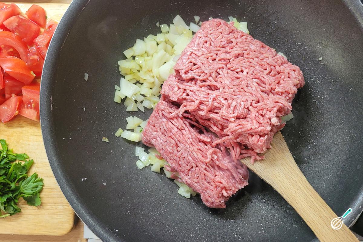 Quando a cebola estiver dourada, adicione a carne e vá quebrando os pedaços para que a carne fique soltinha.