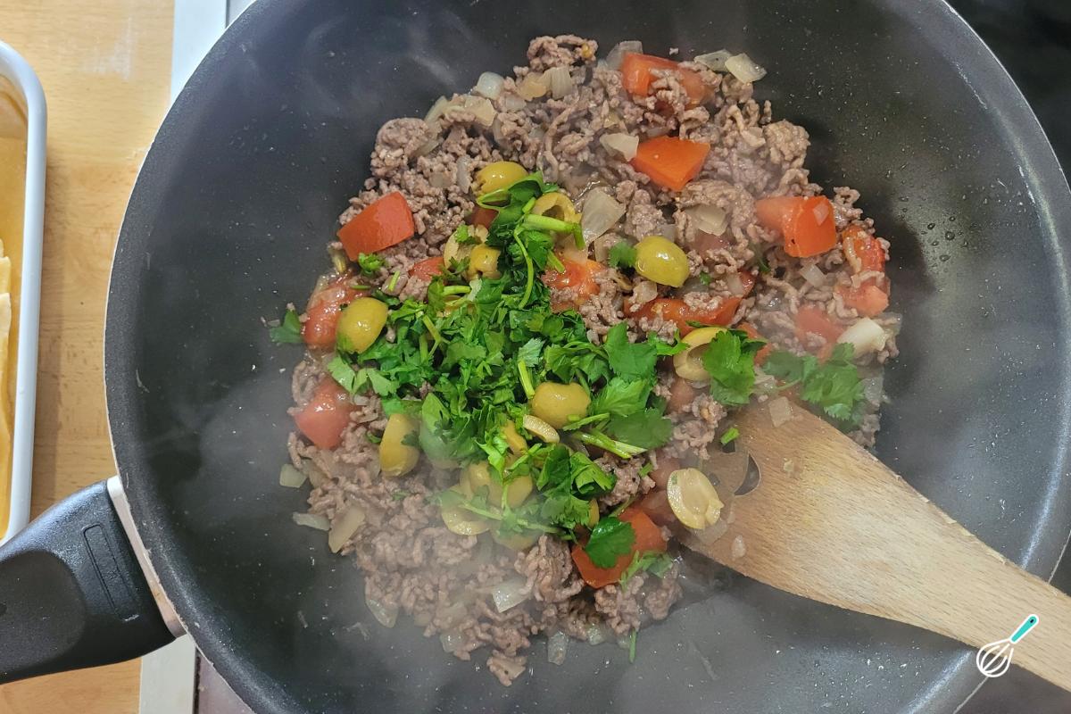 Quando o tomate tiver soltado a água, adicione as azeitonas e o coentro picado. Misture bem e reserve. Deixe o recheio esfriar antes da montagem para que não umedeça demais a massa e fique mais fácil de enrolar.
