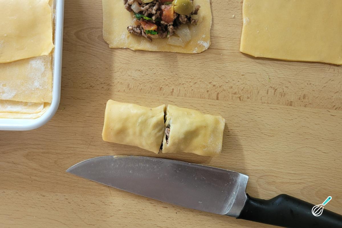 Enrole e depois corte em pedaços do tamanho que preferir e de acordo com o tamanho das folhas de massa que estiver usando.