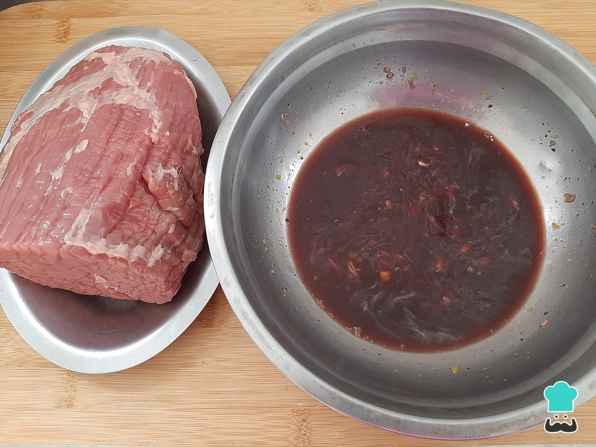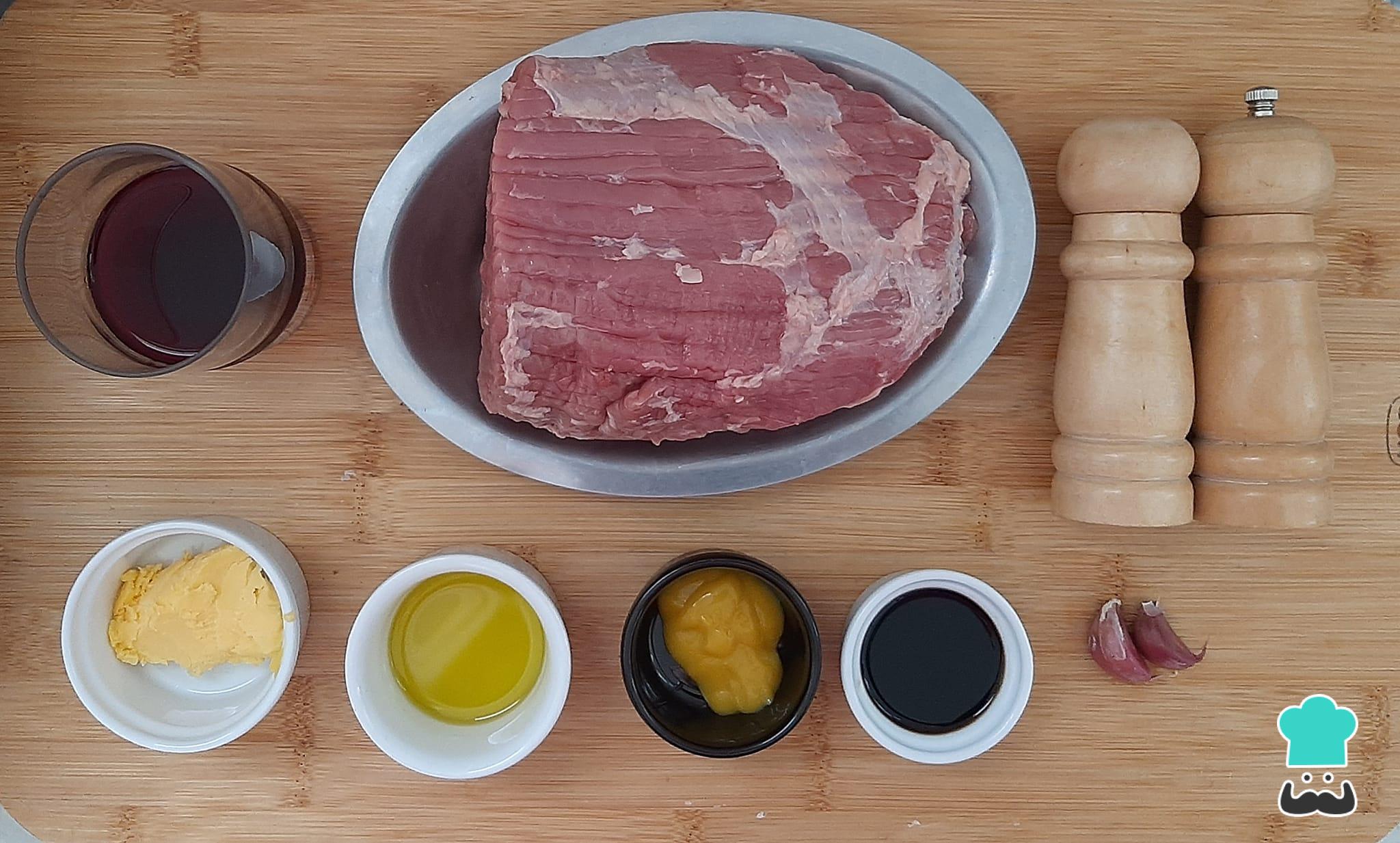Junte os seguintes ingredientes para a marinada: sal, pimenta do reino, vinho tinto, molho shoyu, alho amassado e mostarda. Em seguida, deixe a carne nessa marinada por pelo menos 12 horas, dentro da geladeira.