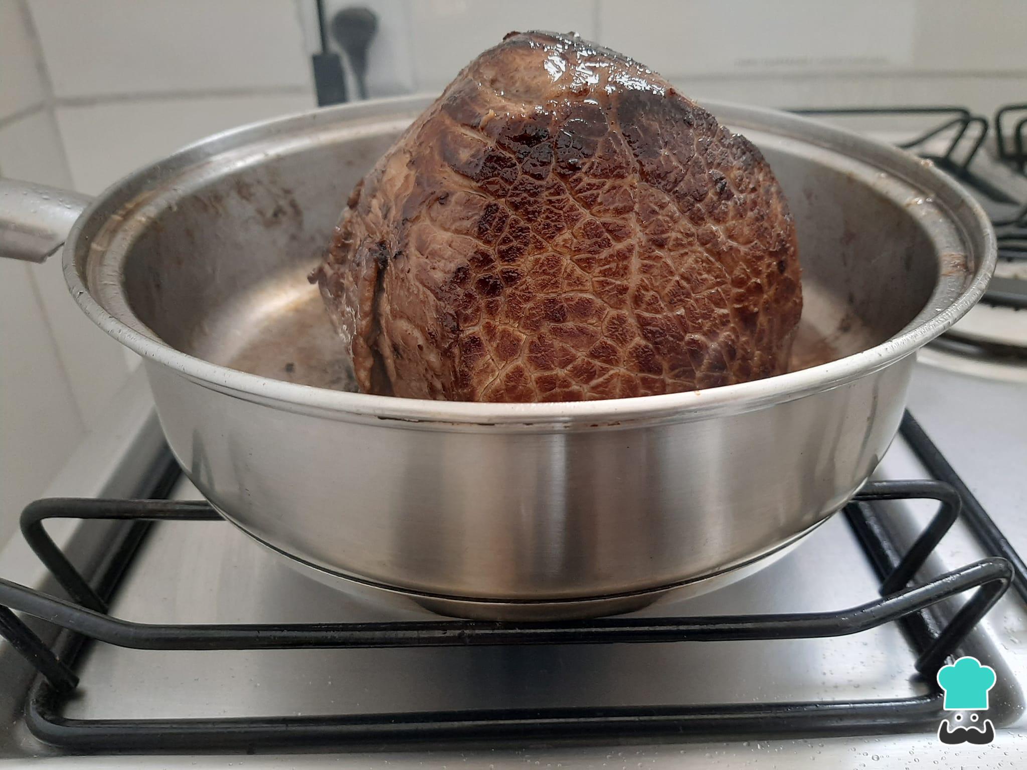 Quando a frigideira estiver bem quente, sele a carne de todos lados (pelo menos 5 minutos em cada lado).