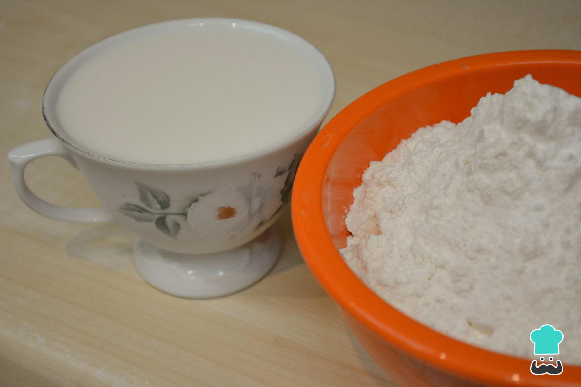 O primeiro passo desta rosca natalina da Palmirinha é preparar a massa. Para isso misture a farinha e o açúcar numa tigela grande e, noutro recipiente, dissolva o fermento e o sal no leite morno.