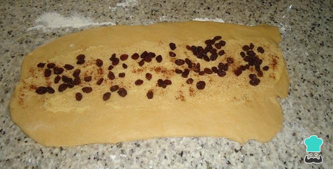 Abra a massa em formato retangular uma superfície enfarinhada e pincele com manteiga derretida. Polvilhe os ingredientes do recheio ao centro e enrole em forma de rocambole. Una as pontas uma à outra e feche bem.