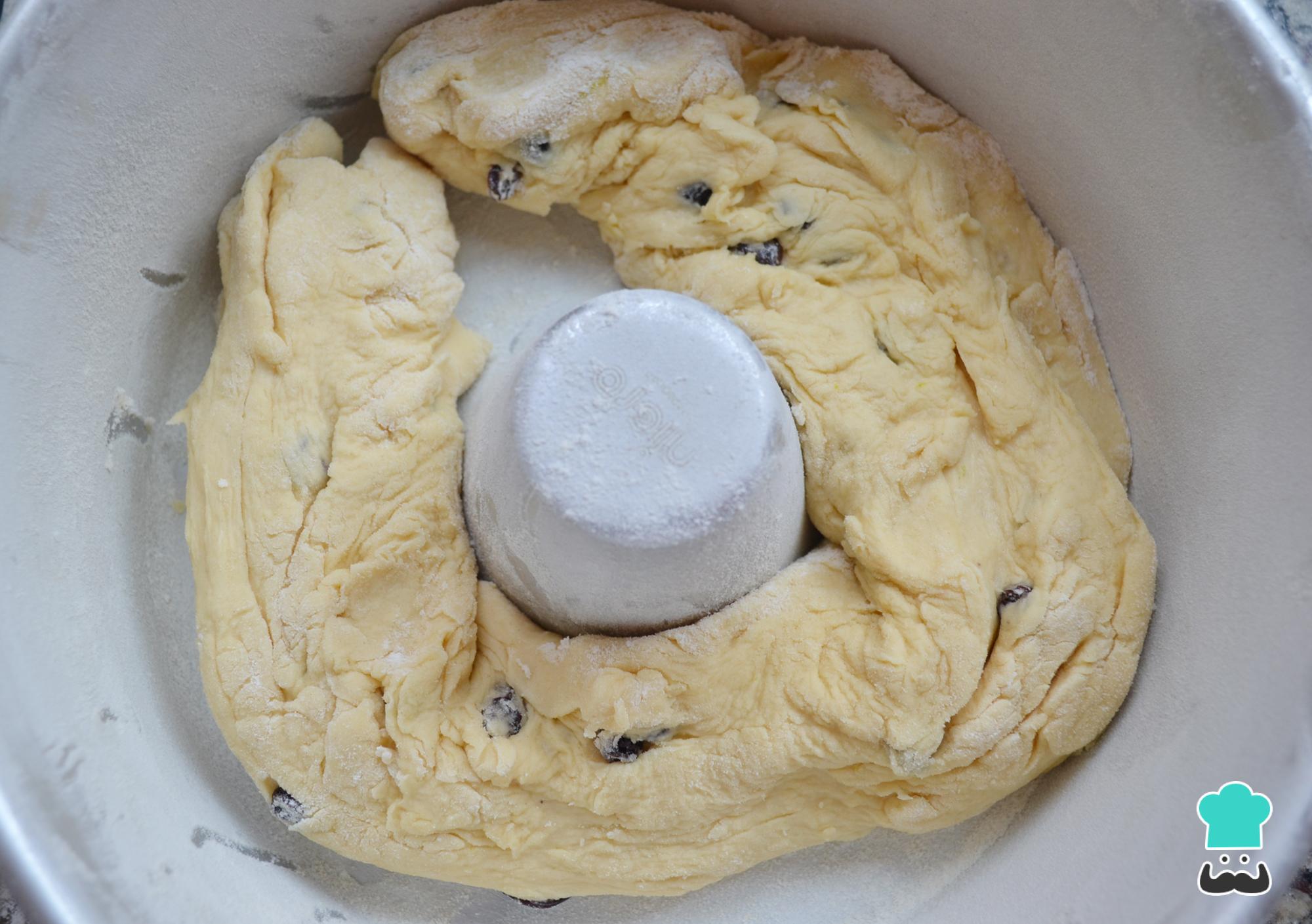 Coloque a rosca em uma forma untada com manteiga e faça pequenos cortes na parte de cima, para que massa da rosca não quebre. Cubra com um pano limpo e deixe descansar por 1 hora, ou até dobrar de volume.