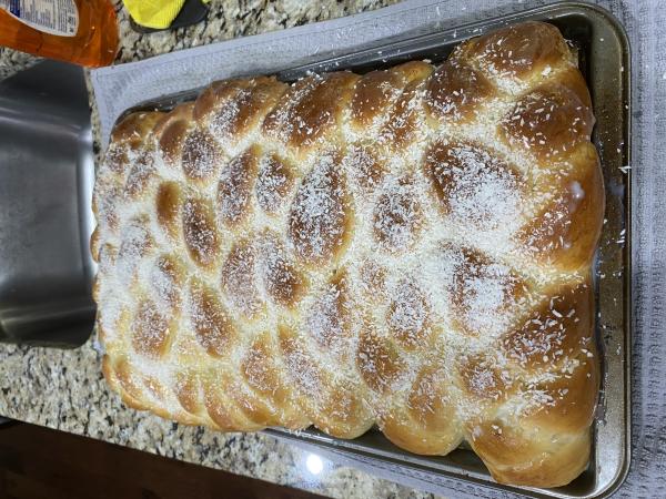 Depois do passo anterior está pronta esta receita de rosca assada fofinha! Deixe esfriar um pouco e delicie-se ao café da manhã ou lanche, tenho a certeza que vai gostar! Bom apetite e deixe sua opinião nos comentários.