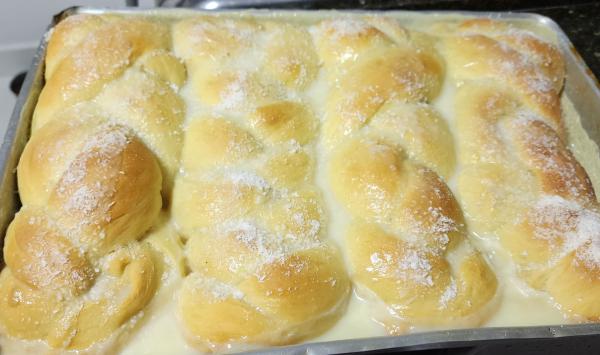 Dica: Não precisa pincelar a massa com ovo antes de assar, pois ela ficará bem brilhante e bonitinha com a cobertura de leites!