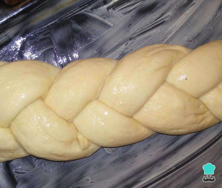 Bata o ovo restante e pincele a trança doce com ele. Coloque em um tabuleiro de forno untado ou forrado com papel manteiga e leve a assar no forno preaquecido a 200ºC por 20-25 minutos.