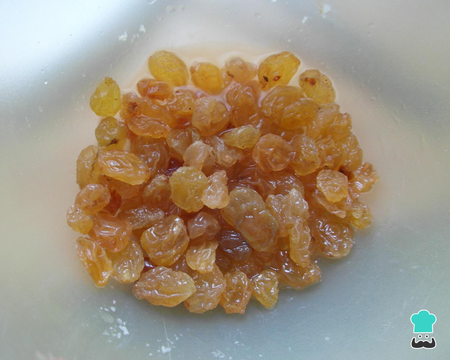 O primeiro passo desta receita de rosca natalina é hidratar as uvas-passa, para isso coloque-as numa tigela junto com o conhaque e deixe por uns 5-10 minutos. À parte dissolva o fermento no leite morno.