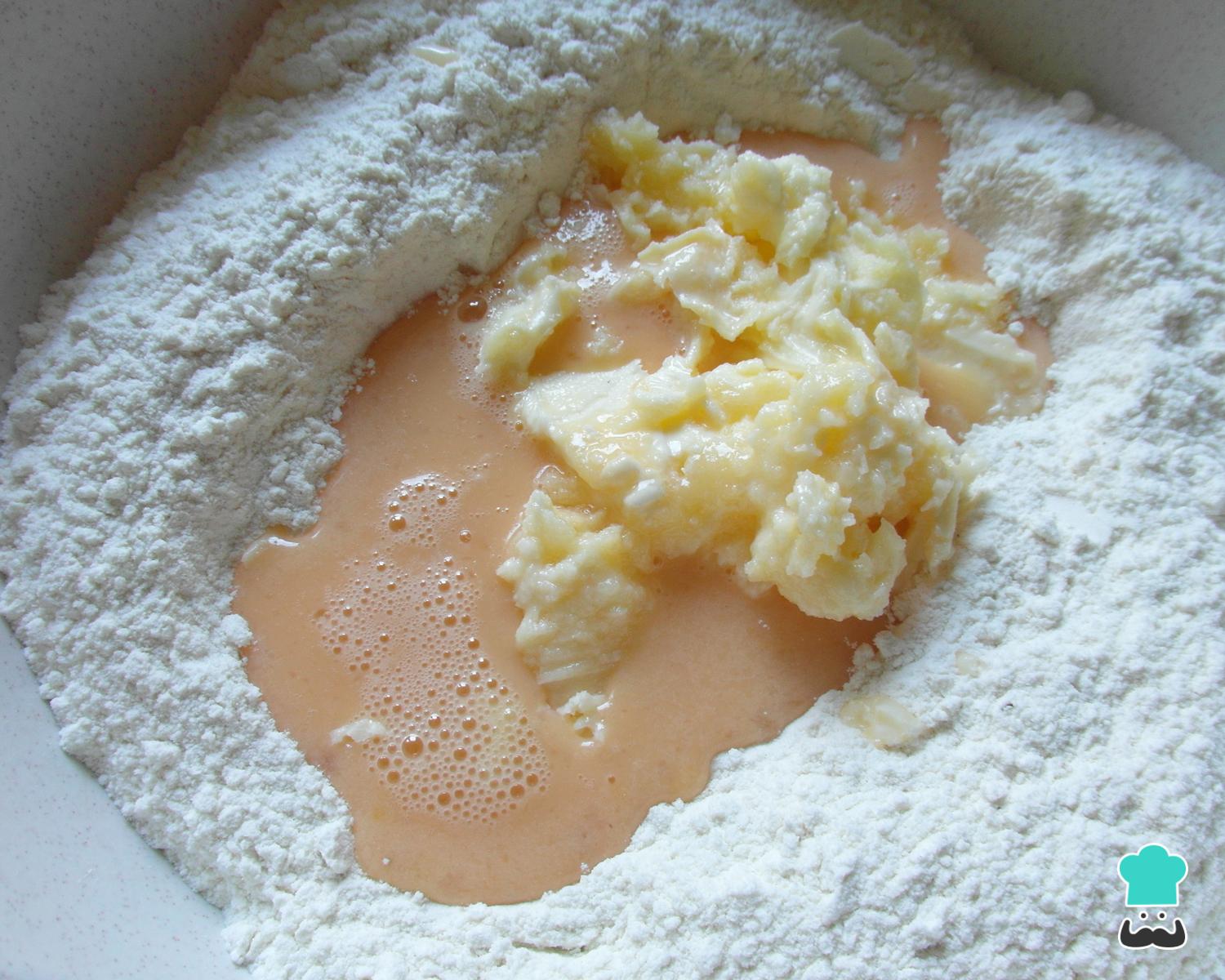 Numa bacia misture os ingredientes secos: a farinha, o açúcar, a noz moscada e a canela. Ao centro adicione os ovos batidos, a manteiga e o leite com o fermento e misture muito bem com uma colher de pau.