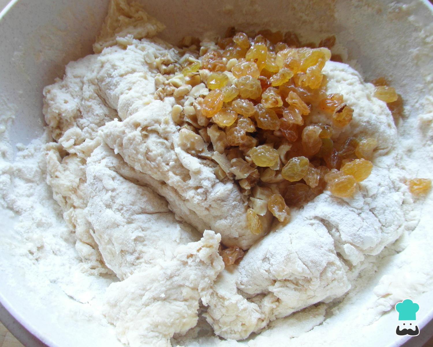 Quando a massa ficar muito densa e pesada, adicione as uvas-passa com o conhaque e as nozes picadas. Na bacia ou numa bancada enfarinhada amasse e sove muito bem a massa com as mãos por 5-10 minutos, até ficar bem lisinha e desgrudando.