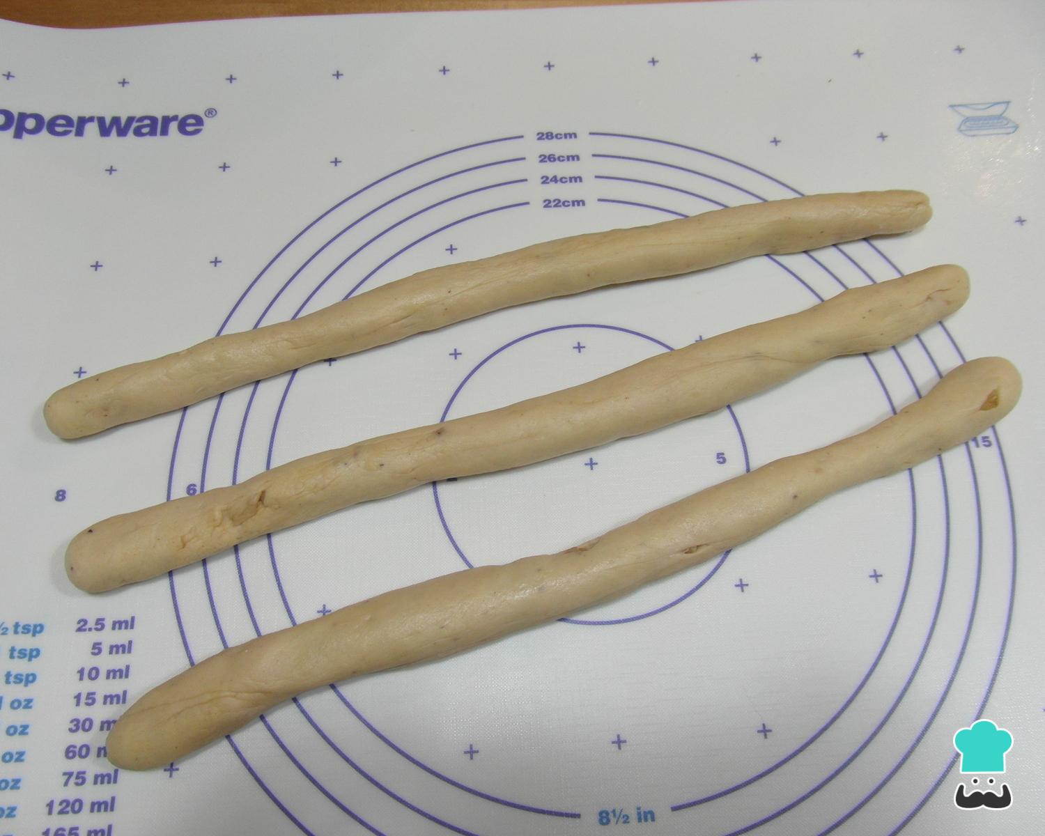 Depois da massa crescer, divida em 12 bolinhas de tamanho igual e modele rolinhos com elas. Separe conjuntos de 3 rolinhos para começar modelando a massa em forma de trança de Natal.