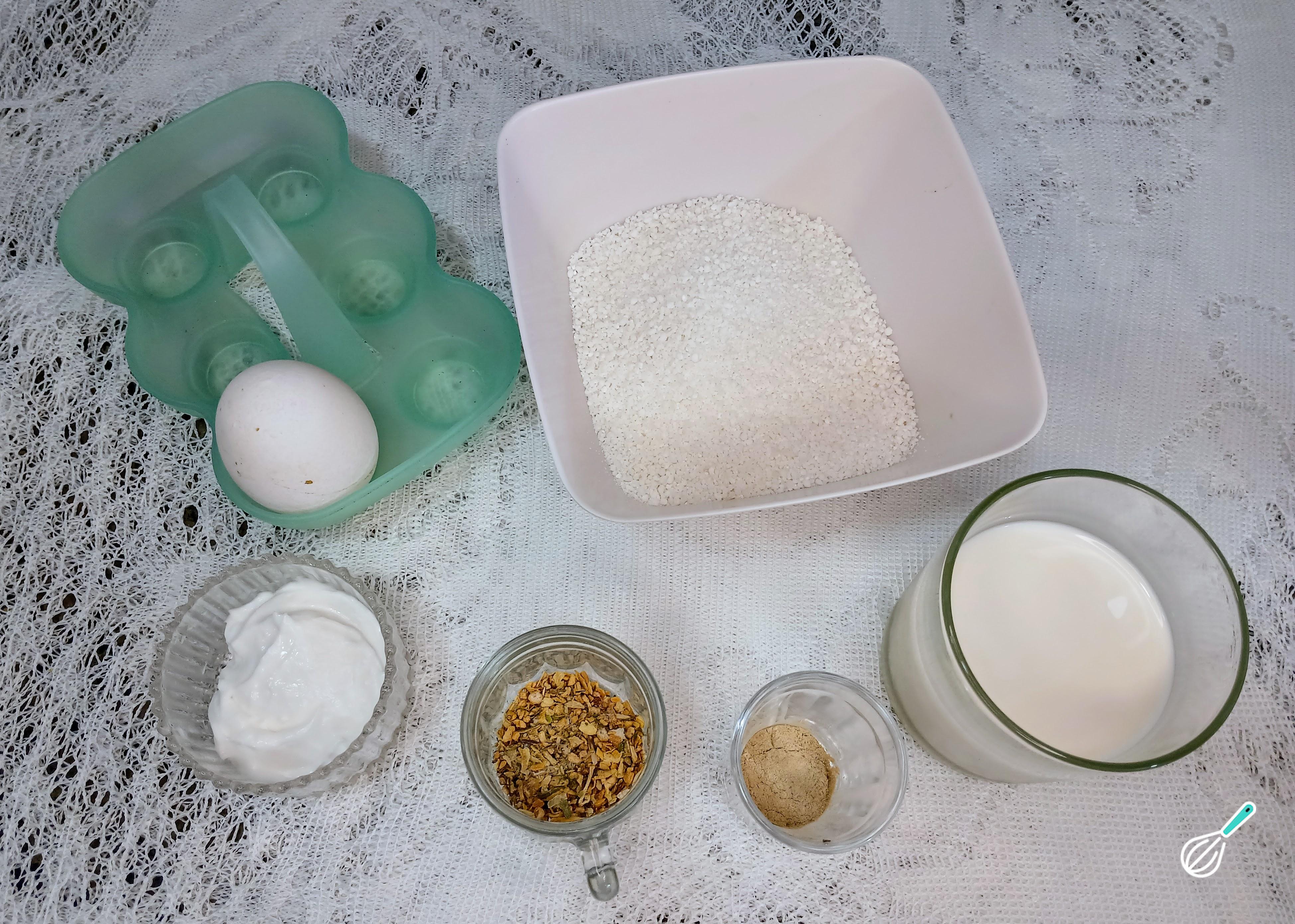 Comece separando os ingredientes para o preparo das rosquinhas de tapioca. Separe a tapioca granulada, o leite, o requeijão, o ovo, os temperos de sua preferência, sal e, se quiser, pimenta.