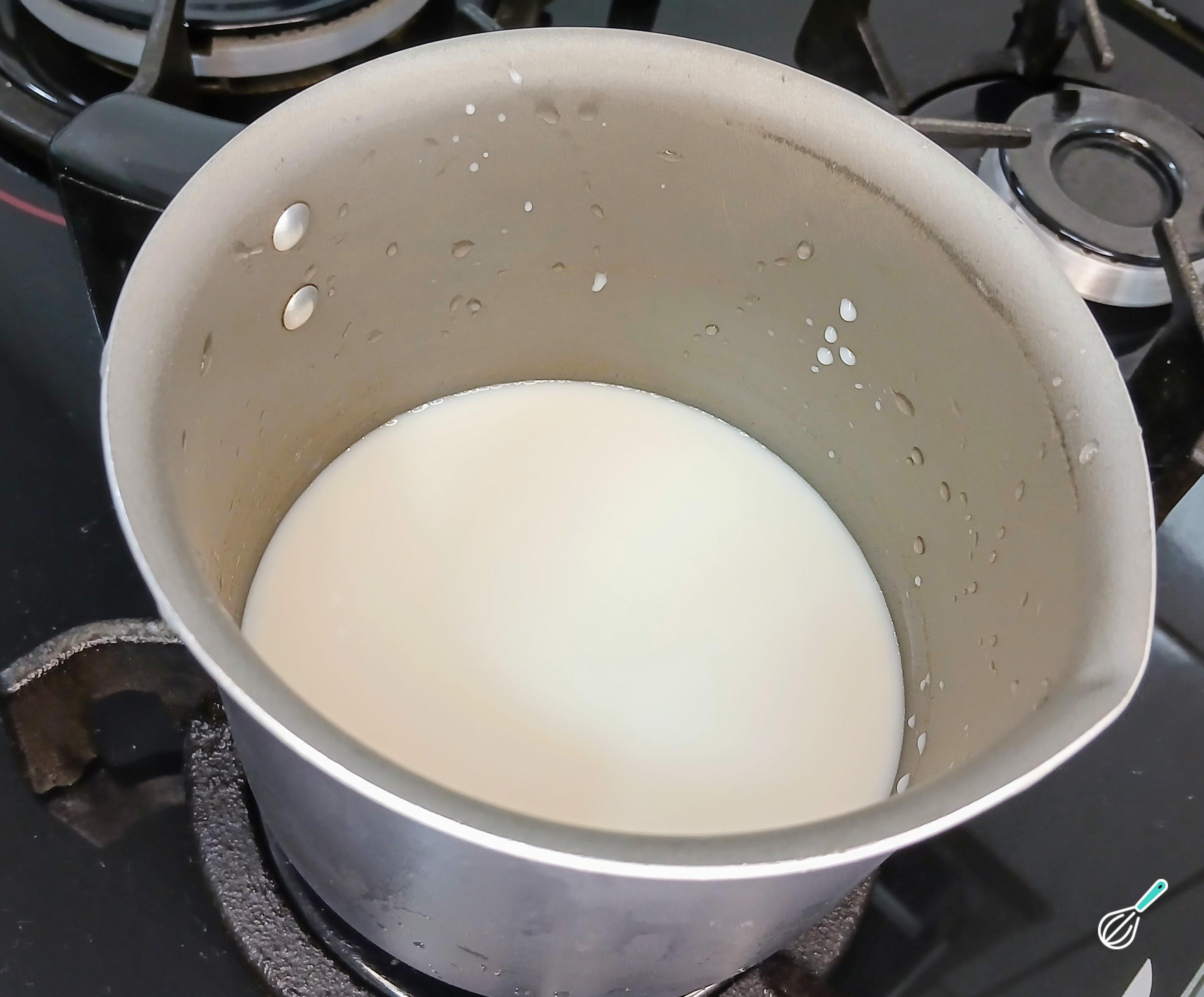 Depois de separar os ingredientes, coloque o leite em uma leiteira e leve ao fogo baixo somente para que fique morno, não é necessário ferver o leite.
