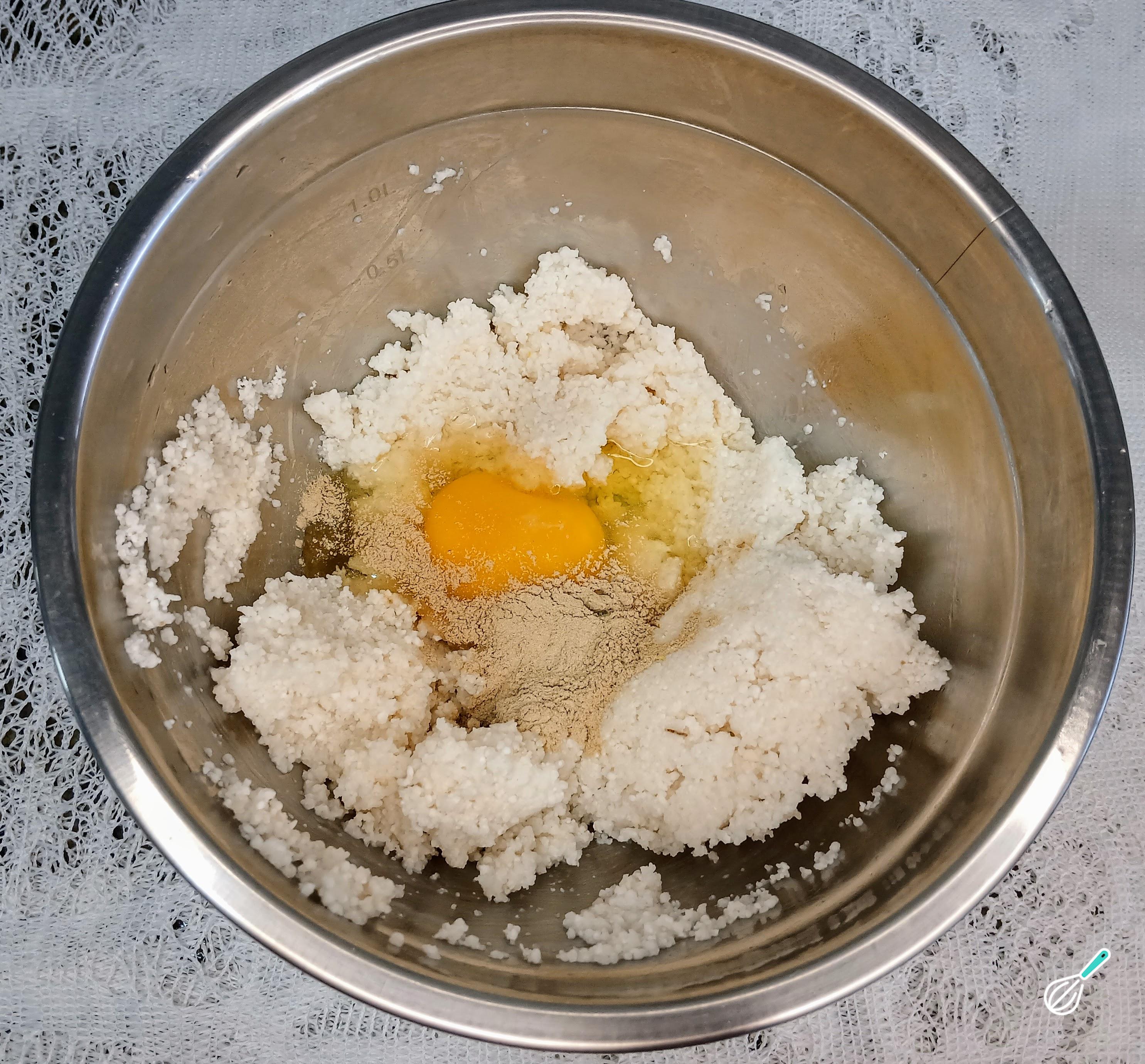 Depois de hidratar a tapioca, adicione o ovo, o sal , o alho em pó e o tempero de chef. Se for utilizar a pimenta moída, adicione também à massa. Misture tudo muito bem para que fique homogêneo e absorva os sabores dos temperos.