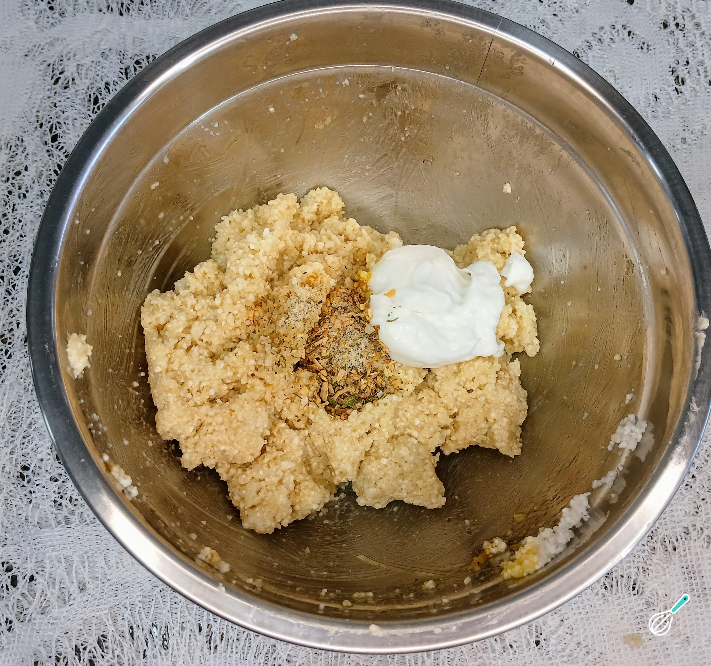 Depois de temperar a massa, adicione o requeijão. Novamente, misture muito bem para incorporar bem o sabor.
