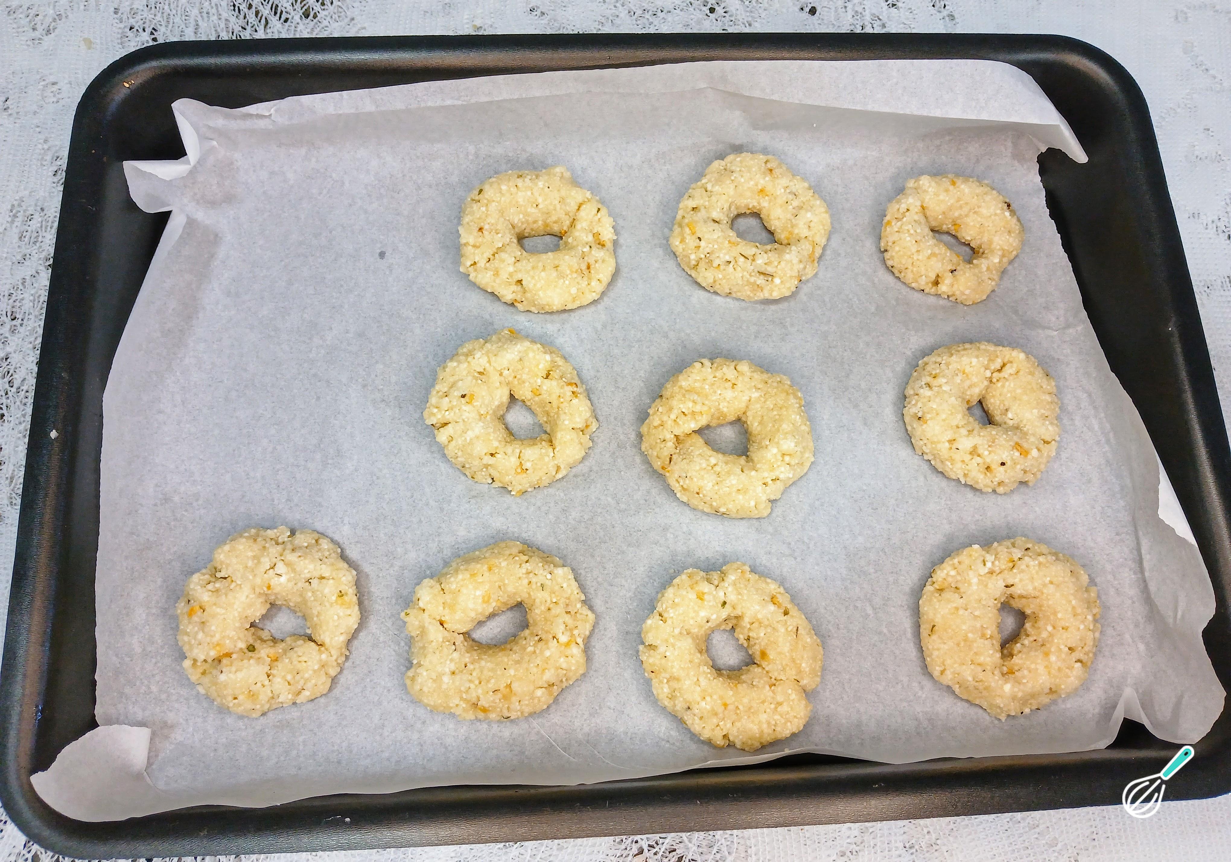 Coloque o papel toalha sobre a assadeira e modele as rosquinhas. Pré-aqueça o forno a 200 graus e leve para assar por aproximadamente 20 minutos. Depois desse tempo, confira se está assado e desligue o forno.