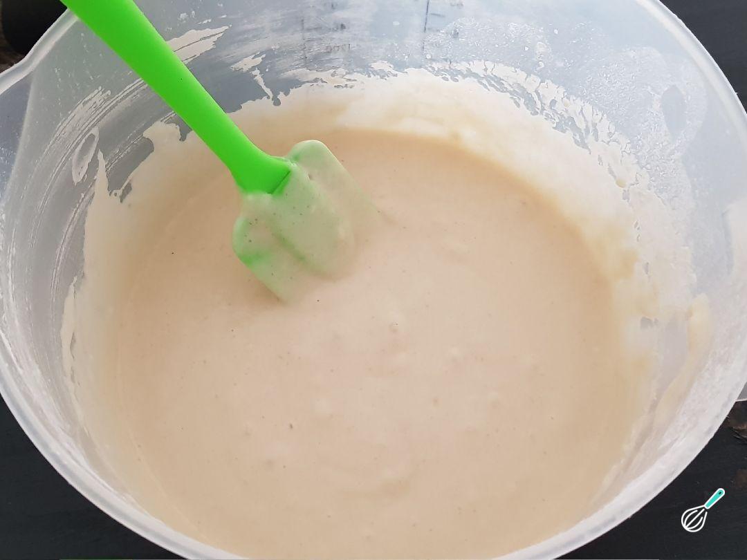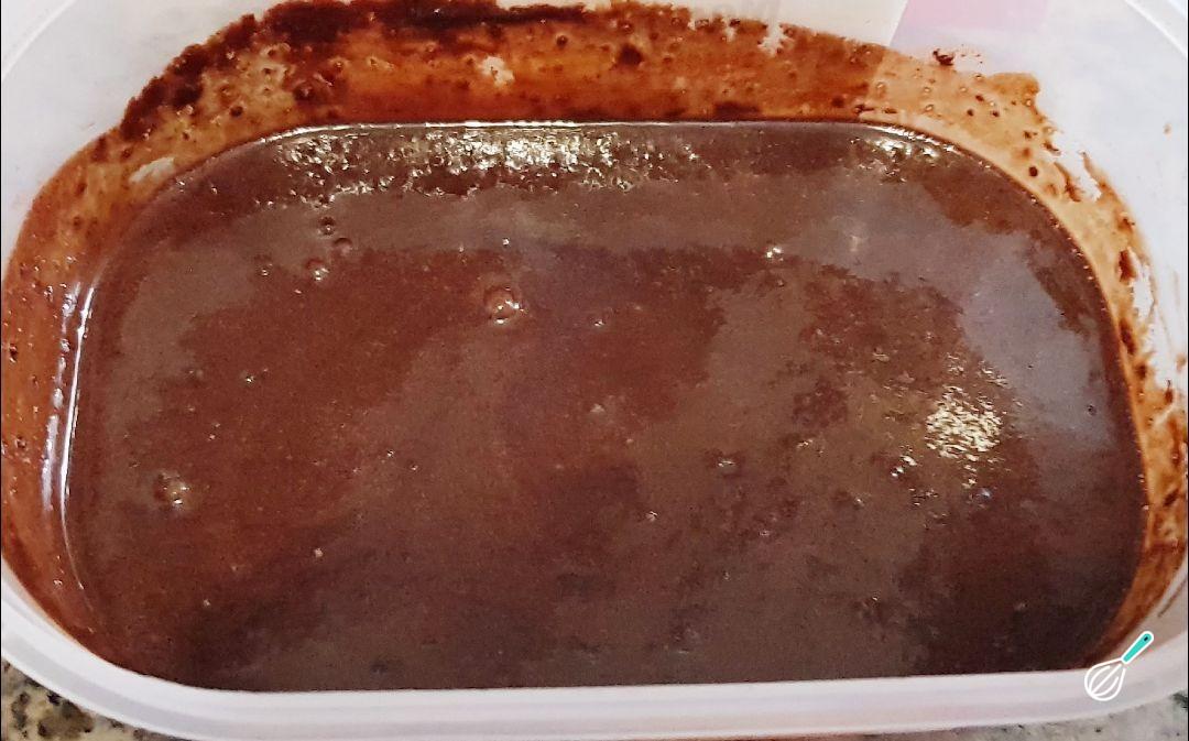 Em um bowl misture os ingredientes secos: a farinha peneirada, o açúcar mascavo, o fermento e o sal. Noutro recipiente misture os líquidos: o vinagre, a essência de baunilha, o azeite e a bebida de soja. Coloque os ingredientes líquidos no bowl dos secos e mexa até misturar completamente.