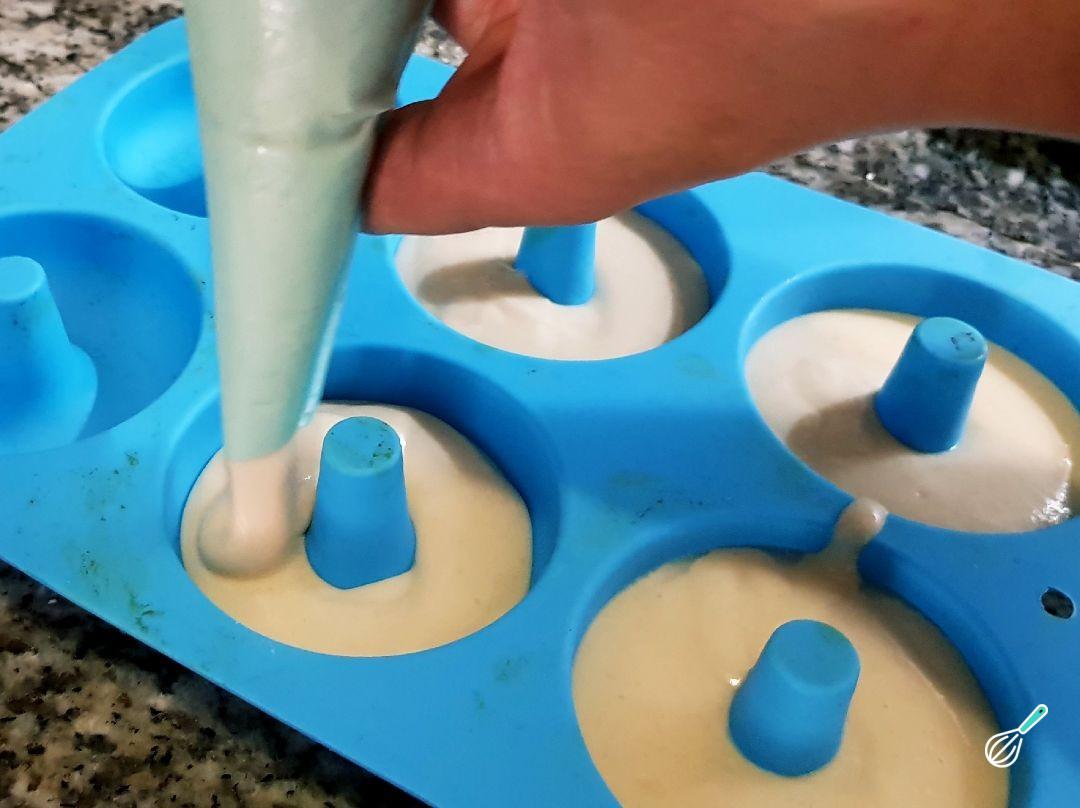 Ligue o forno nos 180ºC e coloque a massa desta rosquinha fácil na forminha para rosquinhas/donuts - será mais fácil se você usar um saco de confeiteiro.